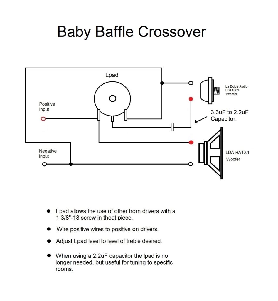 The crossover used is a 3.3uF to 2.2uF capacitor(we suggest a 2.2uF) on the tweeter with an Lpad for level matching. With the 6″ hole, there is no need for a choke on the woofer section. This design gets down to 50hz, and sounds adequate, but benefits as a full-range loudspeaker when using a subwoofer. We are designing an open baffle subwoofer to go with this speaker to function as a system.