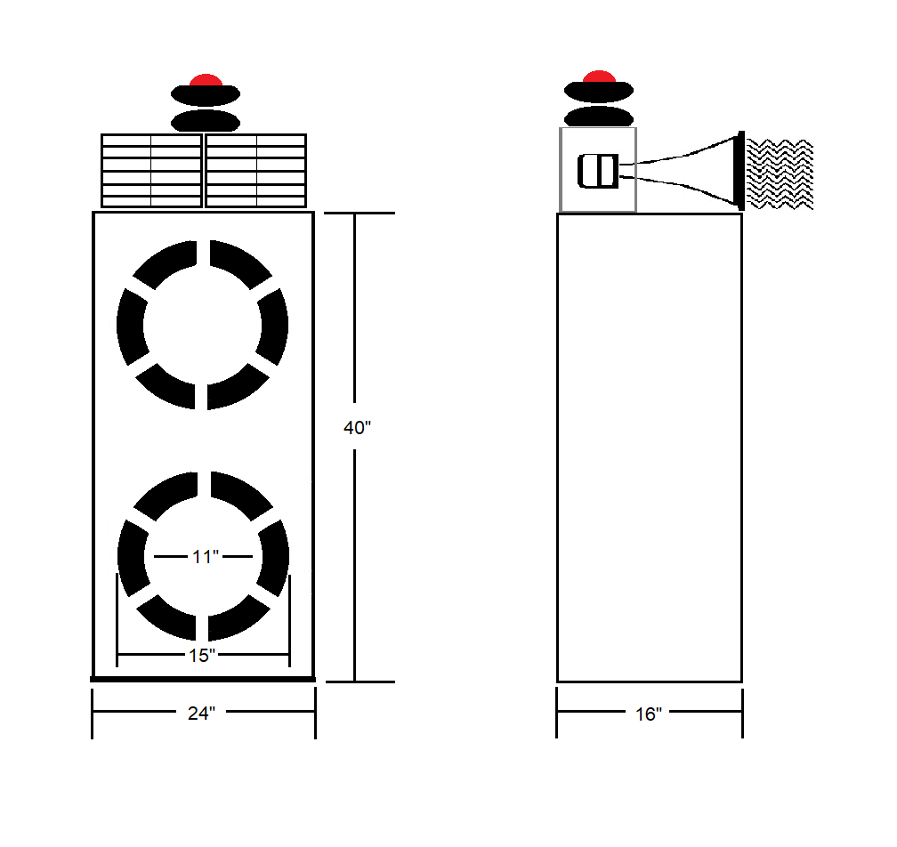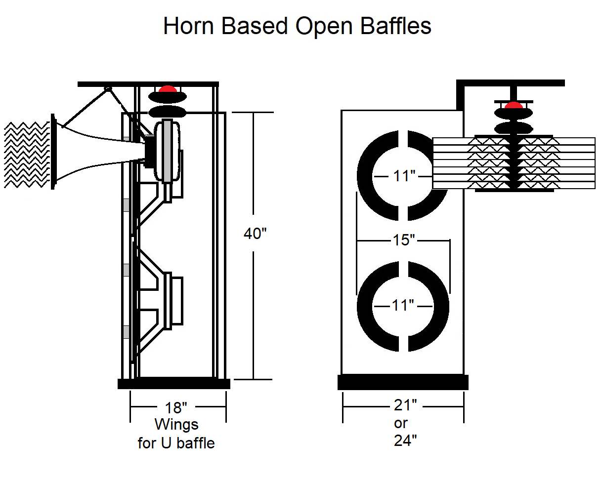 On top sits the mid-range large format horn which comes with a lens and stand, so it can sit on top horizontally as shown. This will allow the horn and its two lens banks to operate essentially baffle-less, and the rear of the horn’s lens projects some sound backward as well The lens should extend beyond the front of the bass baffle section as shown.