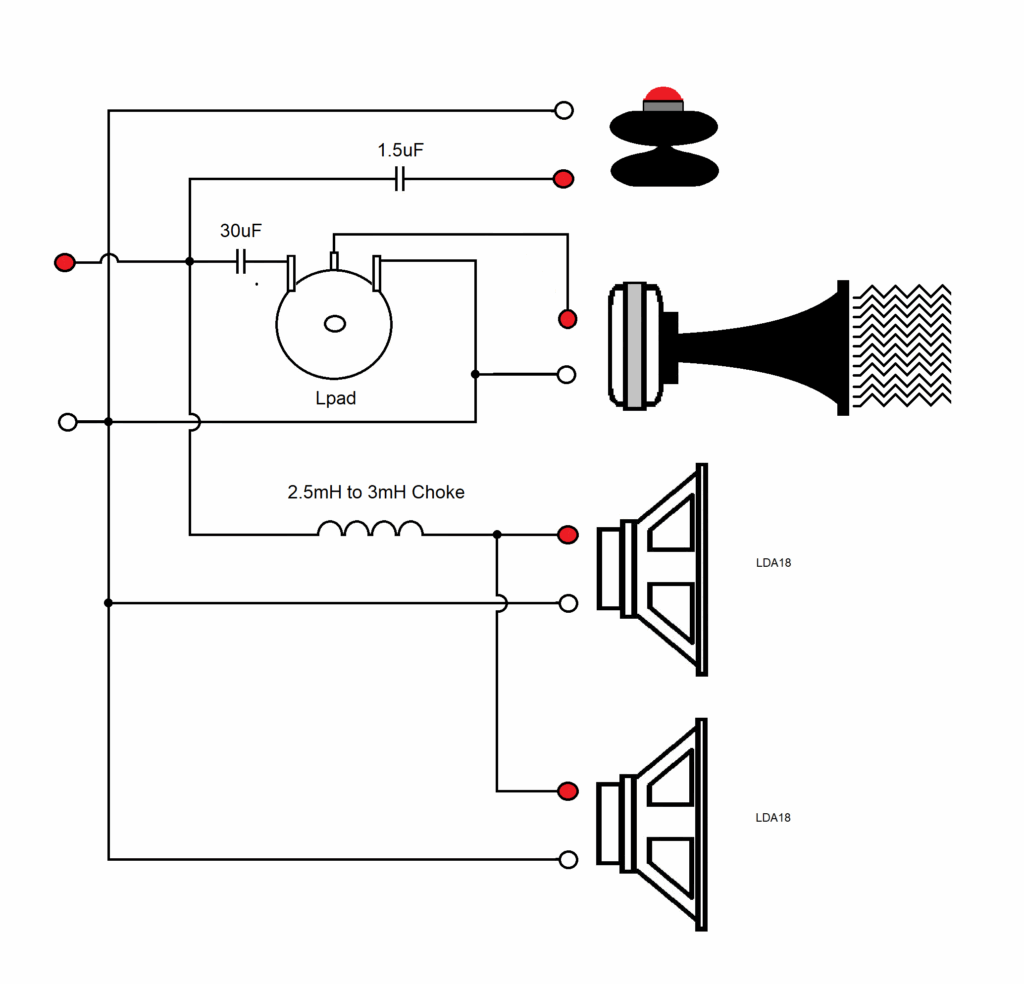 The crossover for this will be a little different, at this point I am thinking you could use the woofers full range using the slot loading as a 1st order low pass filter, and simply use a cap for the tweeter. Since the sensitivity is very close, depending on the driver used, using the LDA1001, or the LDA1002 would not require any Lpad. This is the simplest horn baffle I think I have ever since with only a single 20uF cap as the crossover.